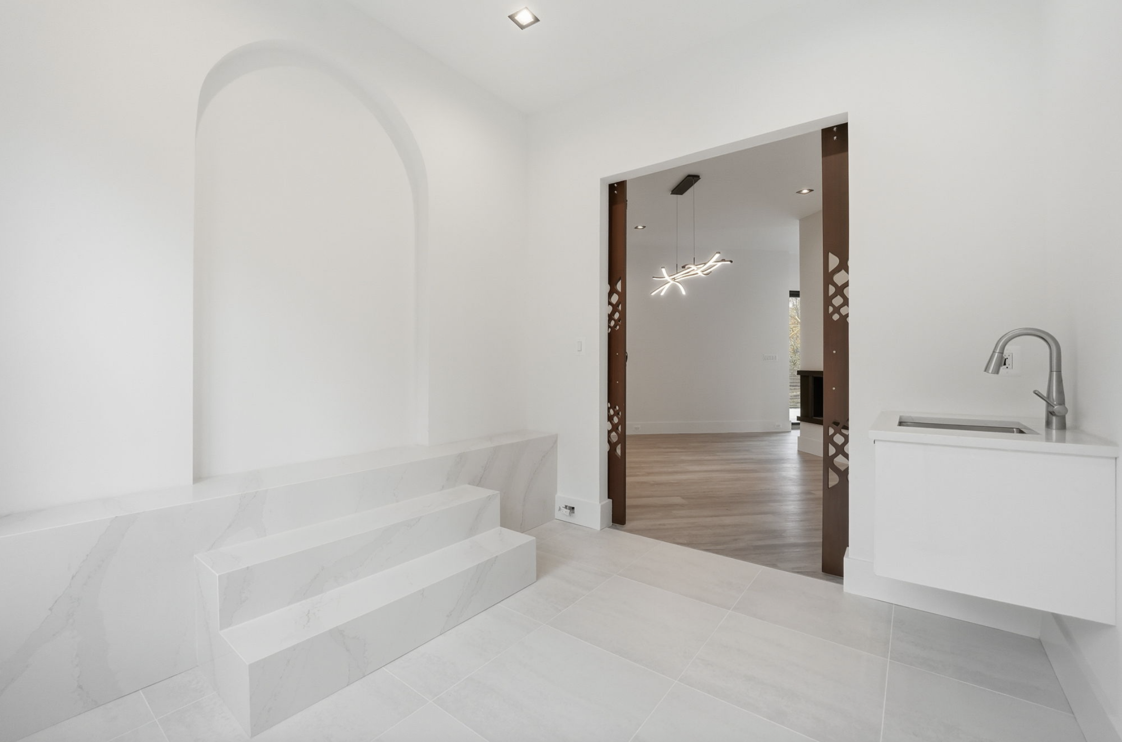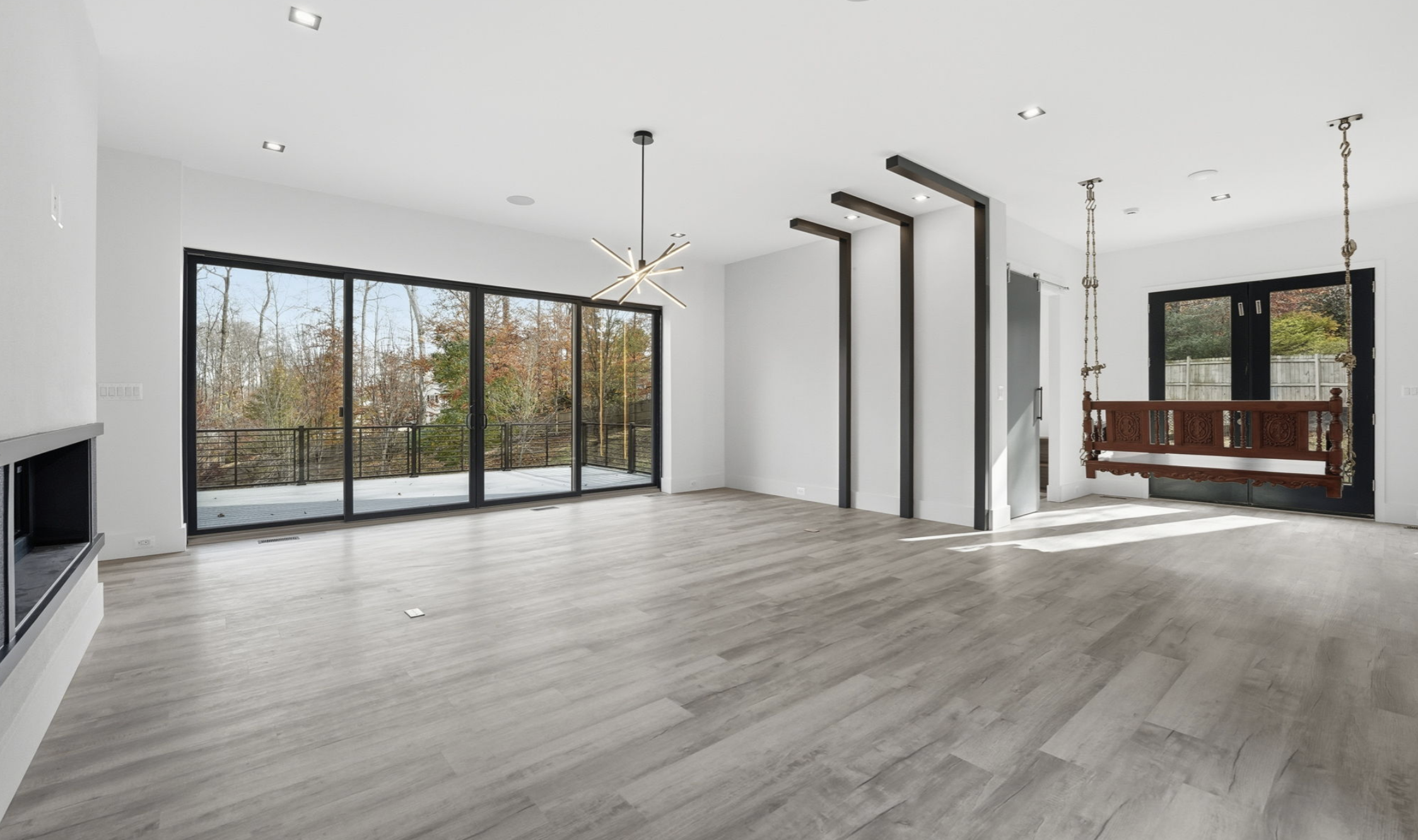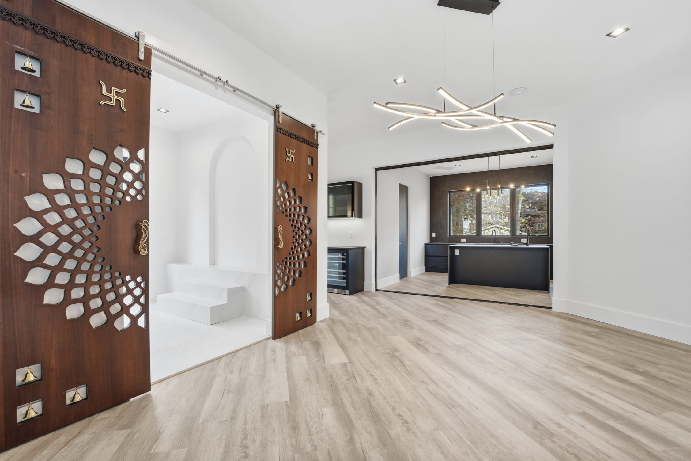 First Floor: Entry foyer, powder room, bedroom and full bath, family room with double sided gas fireplace, kitchen with walk-in pantry, butler’s pantry, dining area, pooja room, laundry room, large covered wood deck.