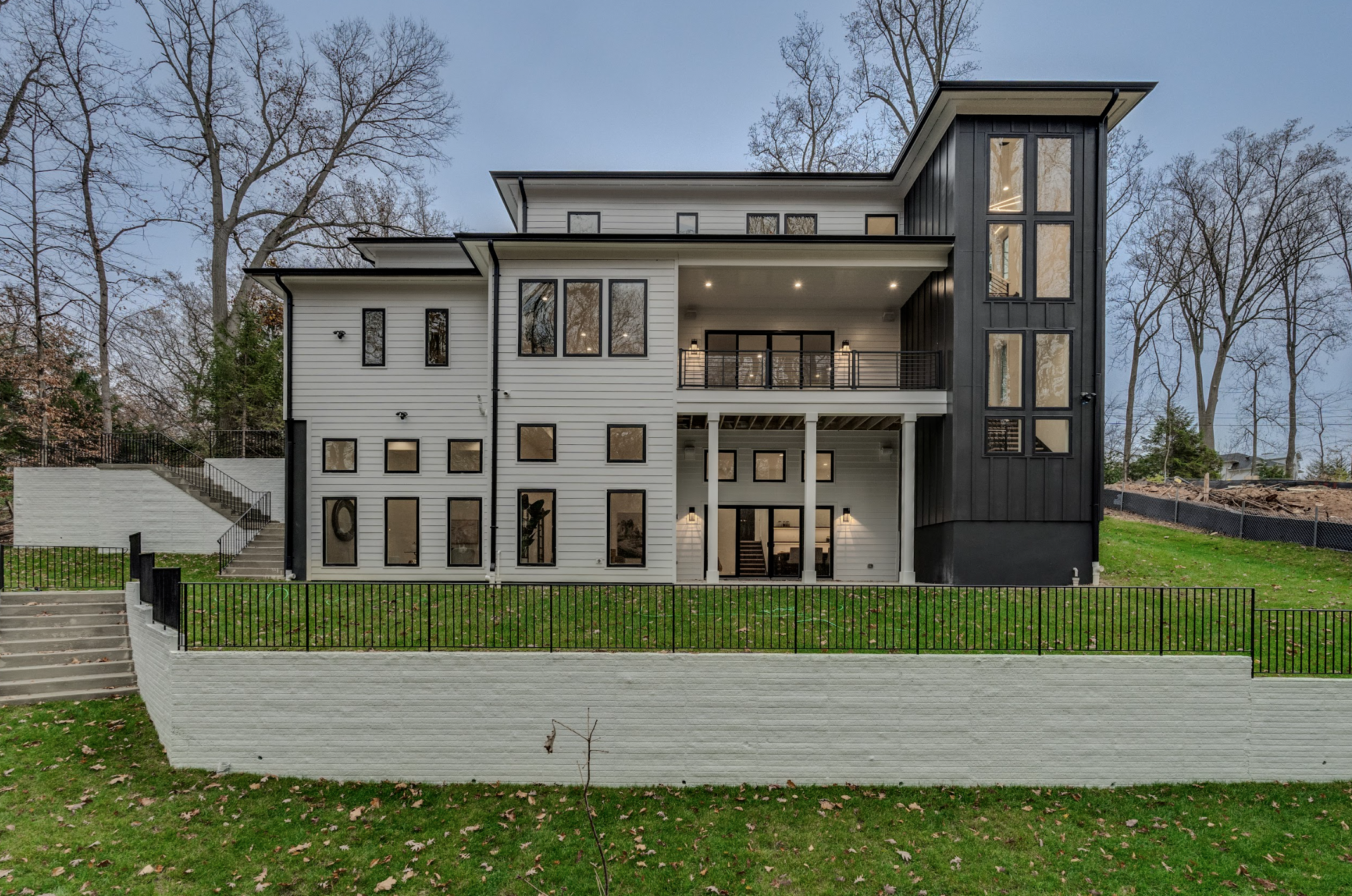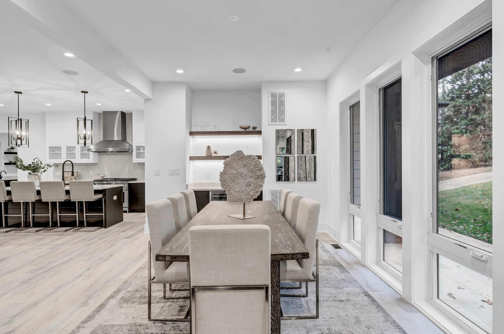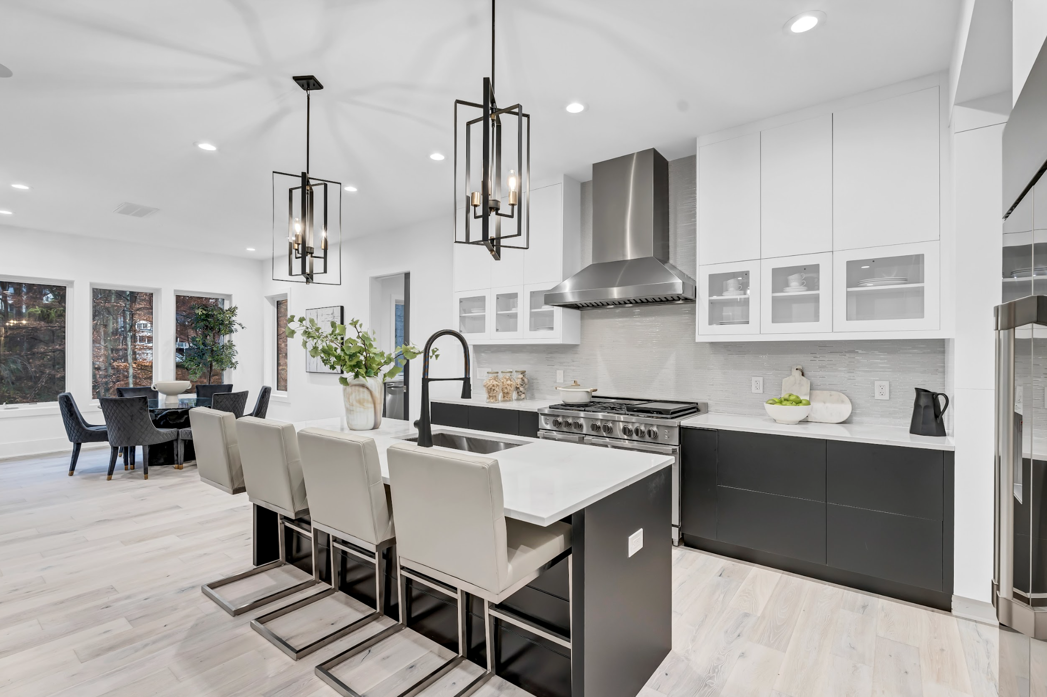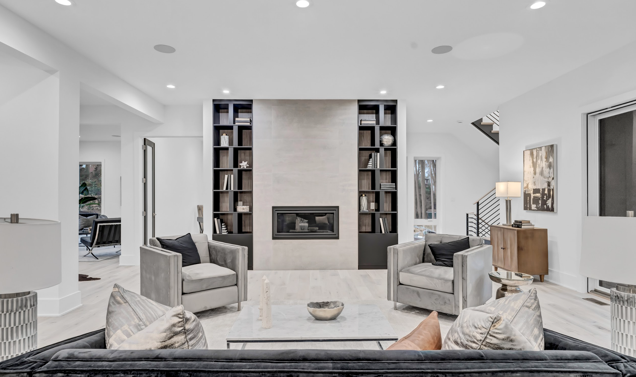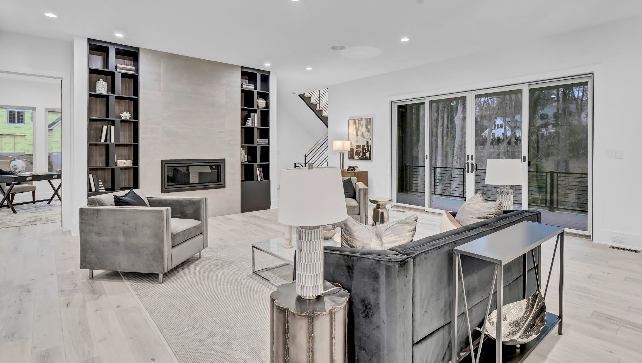 First Floor: Family room with linear gas fireplace, large kitchen and prep kitchen, breakfast area, office space, living and dining rooms, mudroom with washer and dryer, powder room.