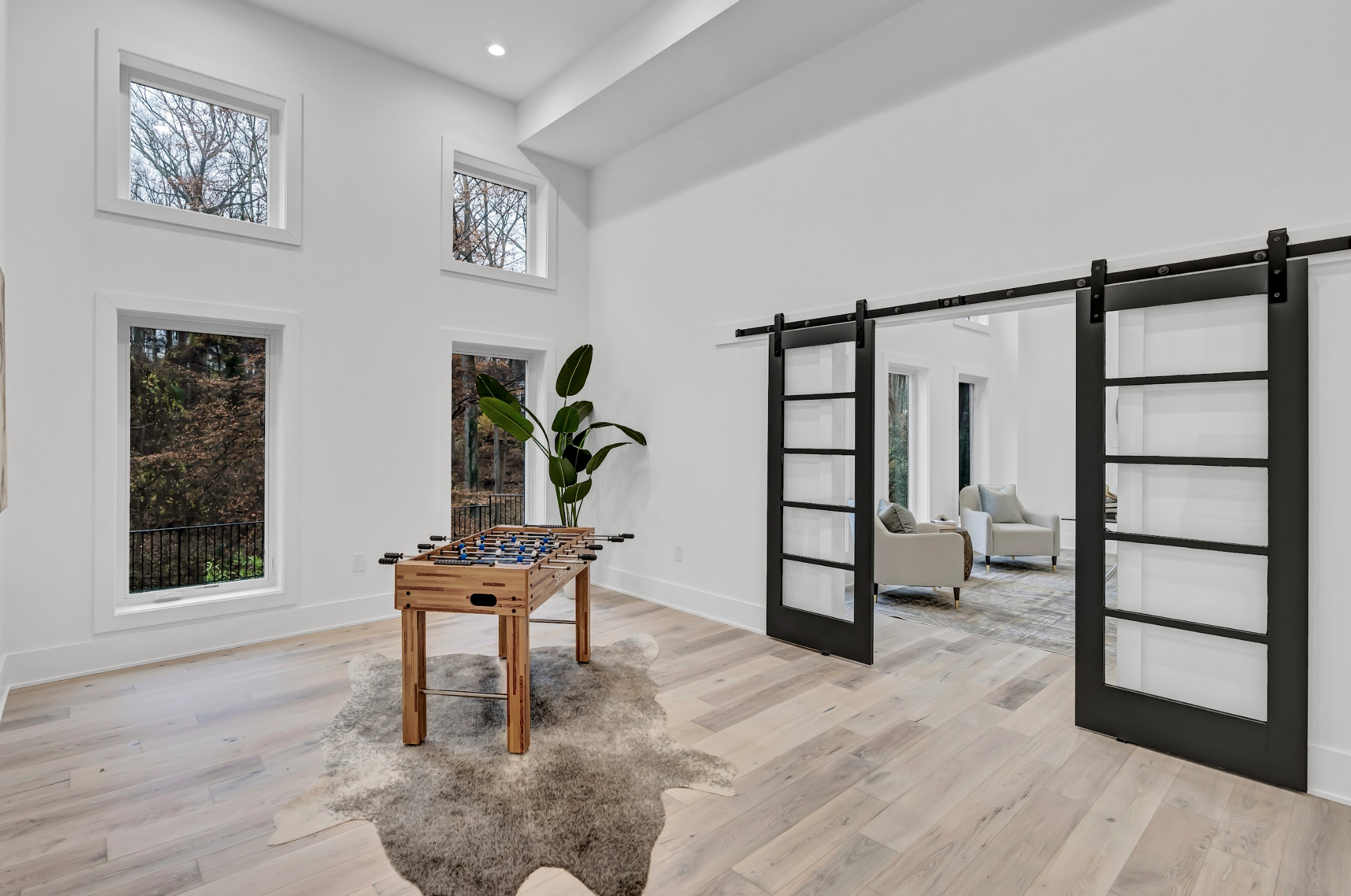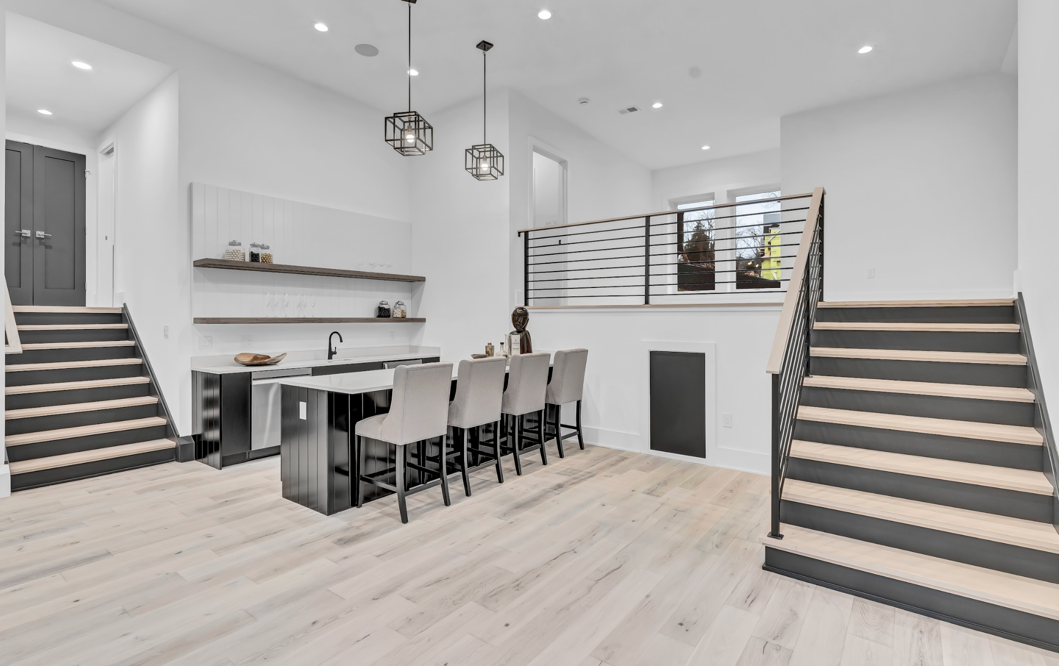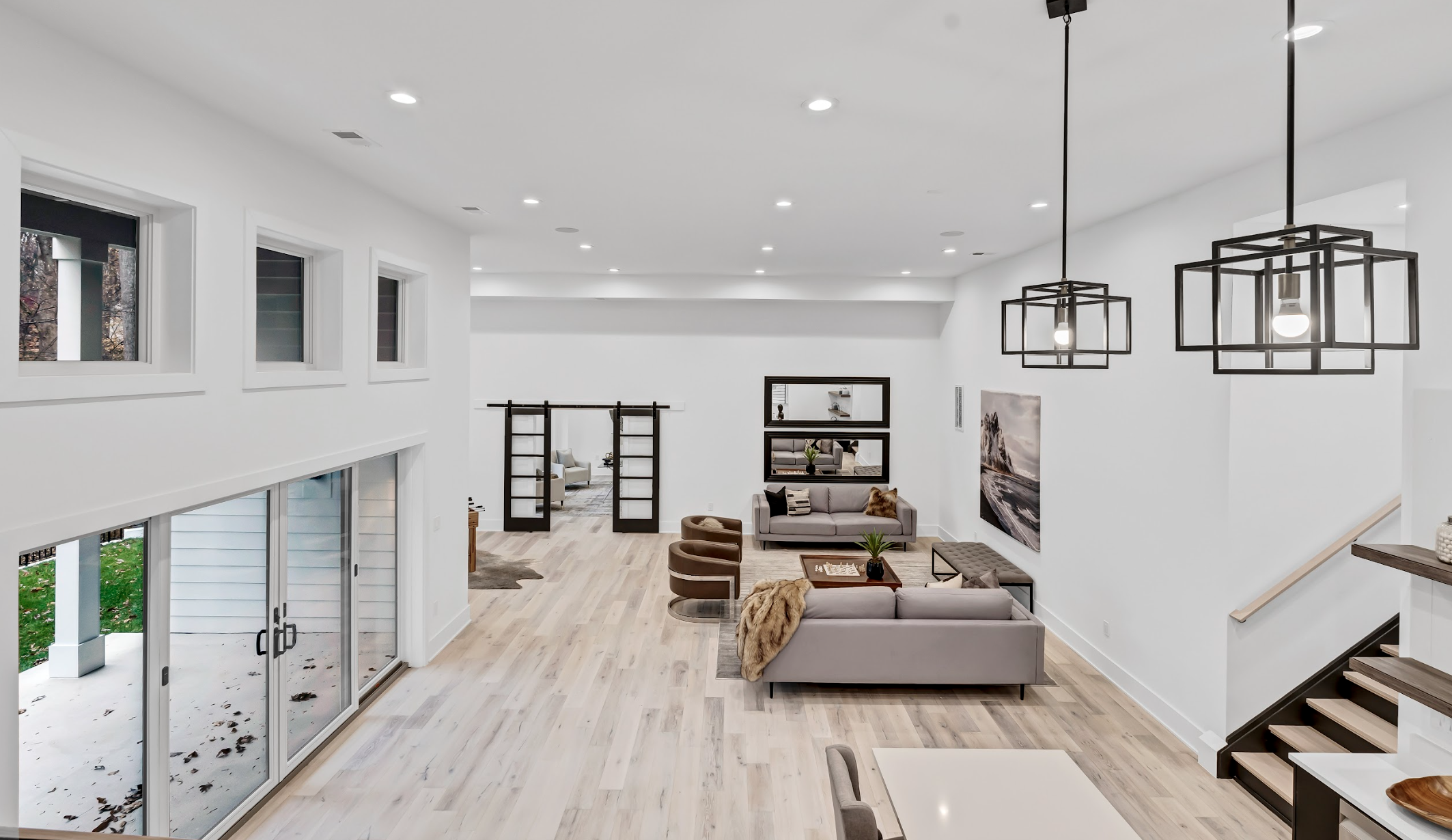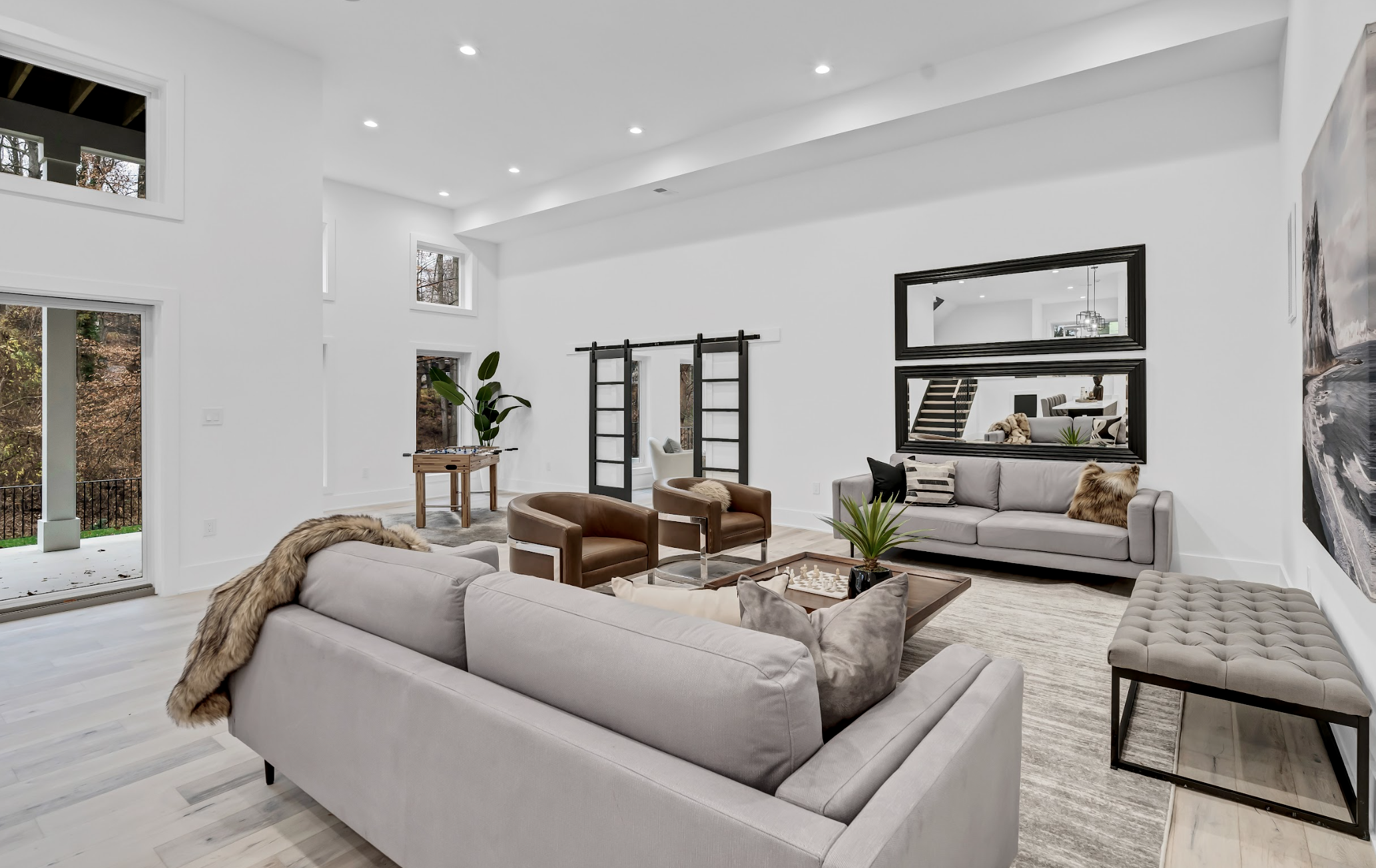 Basement: 14-foot high ceiling, wet bar, exercise and recreation rooms. Basement opens directly to landscaped backyard for indoor/outdoor living.
